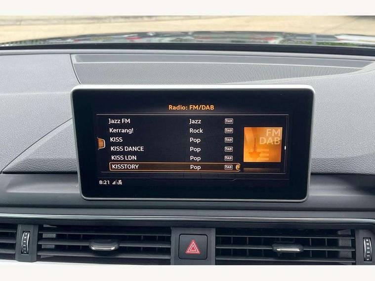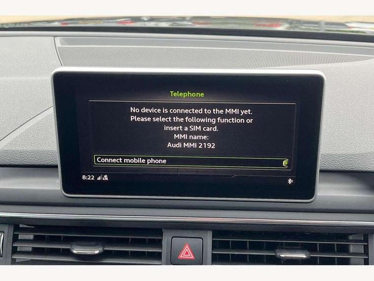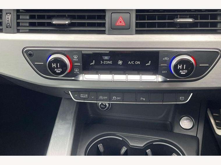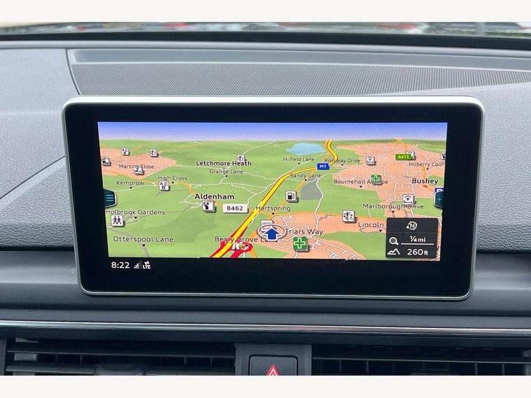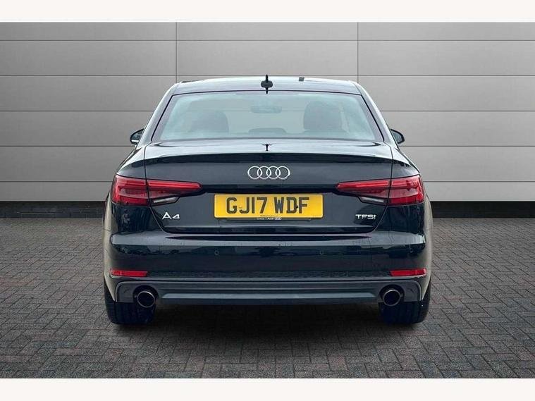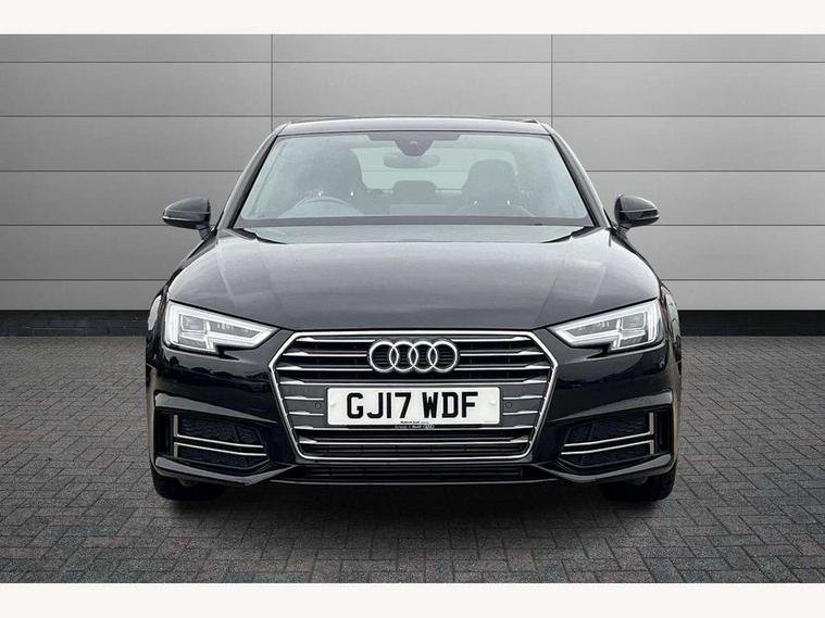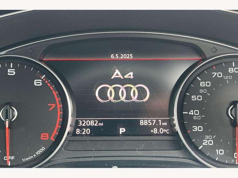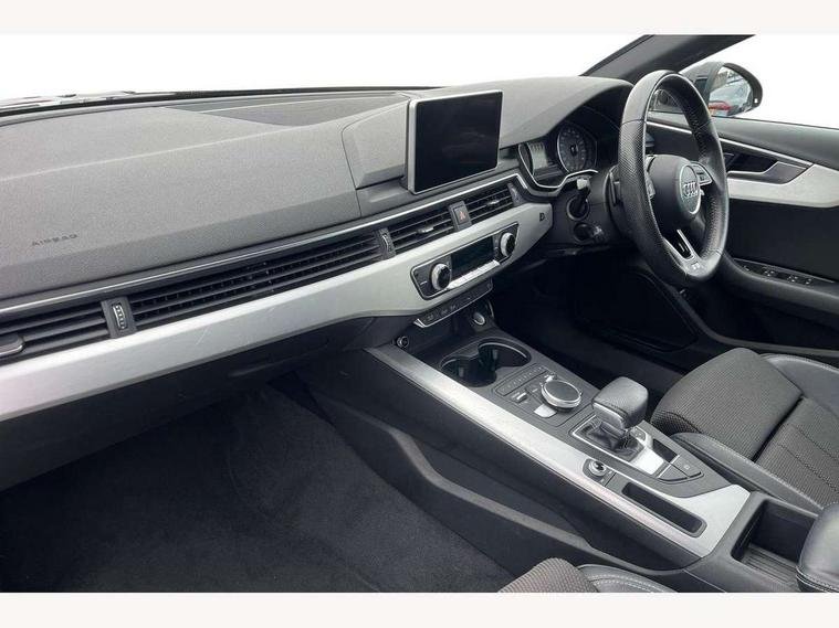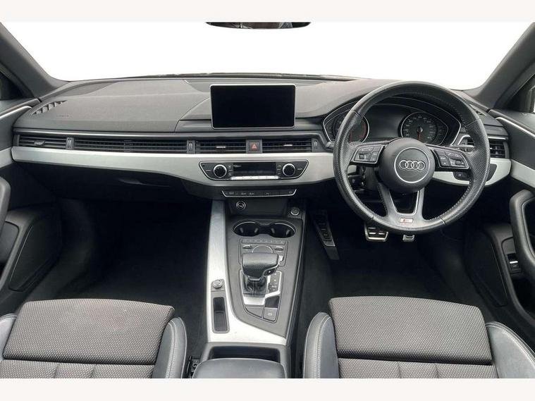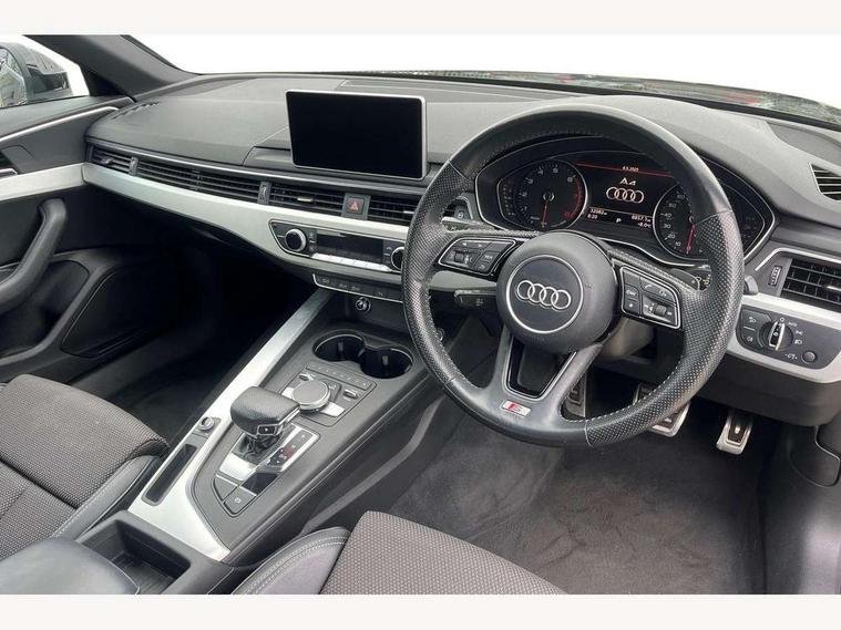 Audi drive select, Audi Pre sense collision avoidance, Audi smartphone interface, Auto boot lid opening, Electro-mechanical PAS, Service interval indicator, Stop/start button, Voice control system, 2 USB ports, Aux input, DAB digital radio module, MMI radio plus with CD player, Acoustic windscreen, Air inlets in titan black with two horizontal inlays in chrome, Auto dimming rear view mirror, Automatic headlights + automatic windscreen wipers, Body colour bumpers, Chrome door handles, Chrome rolled exhaust, Electric adjustable heated door mirrors, Electric front windows, Electric rear windows, Headlight range control, LED daytime running lights, LED indicators in door mirrors, Rear diffuser in Twilight grey matt, Roof spoiler, 3 zone climate control, Black cloth headlining, Front centre armrest with 12v socket, Front sport seats, Front/rear floor mats, Gearshift paddles, Illuminated door sill finishers, Isofix child seat preparation for front passenger/outer rear seats inc passenger airbag deactivation, Jack and tool kit, Perforated leather gearknob, Reach + rake adjustable steering column, Rear headrests, Split folding rear seats, Stainless steel foot rest, Stainless steel pedals, Sunvisors with vanity mirrors, Top tether anchor plate for isofix child seat, S line exterior styling pack - A4 Saloon, 3 point seatbelts on all rear seats, ABS/EBD, Adaptive driver and front passenger airbags, Electromechanical parking brake, ESP, First aid kit, Front head airbags, Front seatbelt pretensioners + load limiters, Front side airbags, Multi-Collision braking, Seatbelt warning, Traction control, Tyre pressure monitoring system, Warning triangle, Keyless Start, Locking wheel bolts, Remote central locking, Thatcham category 1 alarm + immobiliser,